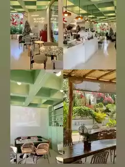 The cafe is decorated with trees and adorable miniature flowers.