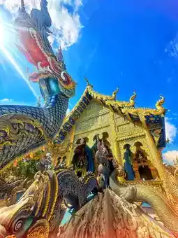Wat Rong Suea Ten, also known as the “Blue Temple,” is a temple that stands out with its modern Thai design combined with contemporary art. The main highlight is the striking blue-dark blue color scheme of the viharn. Decorated with gold patterns and beautiful sculptures around the viharn, the temple gives the religious complex a lifelike and distinct dimension, unlike any other temple.
