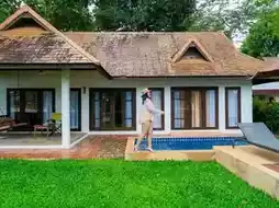 🏡 This time, Moo and her friends stayed in a Two Bedroom Pool Villa, featuring two bedrooms, two bathrooms, a central living room, a balcony, and a private pool right on the river. The villa offers over 185 square meters of living space. Enjoy in-room dining or enjoy the Afternoon Tea set on the balcony, enjoying the cool breeze and the natural surroundings.
