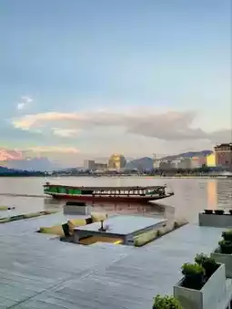 📍The nighttime view of Chiang Saen is absolutely stunning. Sit by the Mekong River and enjoy the scenery of mountains from Laos. It's especially beautiful at night with the illuminated buildings on the Laos side, creating a breathtaking sight. Flow Chiang Saen is located outside Chiang Rai city, about a 45-minute drive away. This place is both a café and a restaurant, offering savory dishes, desserts, and drinks all in one spot. ✨️