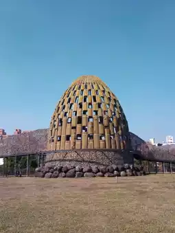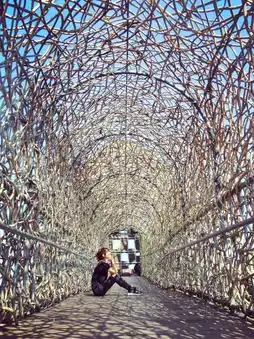 This park features a dome made of stacked wood and walkways woven from rattan, creating picturesque spots that utilize natural materials.