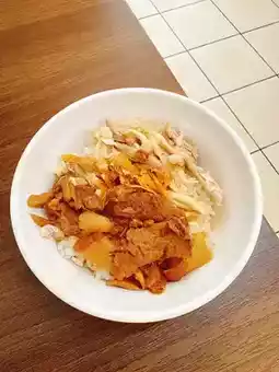 The small portion of chicken rice is a standard serving size. The braised pork pieces are sliced thin but slightly larger, tender, and well-seasoned. The shredded turkey is also moist and blends well with the rice, making it quite flavorful.