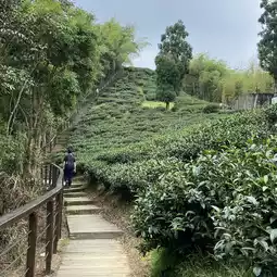 The trail is surrounded by lush greenery, weaving through layers of tea plantations. The air is fresh, and the scenery is picturesque, making you feel as if you're wandering through a natural painting. In the latter part, the trail transitions into a bamboo forest path, where gentle breezes and serene surroundings provide the perfect setting to relax and rejuvenate.
