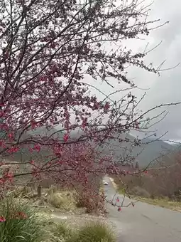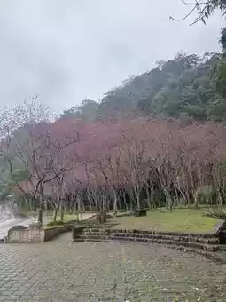 If you take a detour to Qijiawan Creek, the gentle sound of flowing water intertwines with the cherry blossoms, creating a soft and serene moment unique to Taiwan's mountain forests.