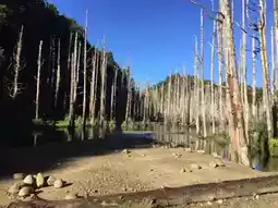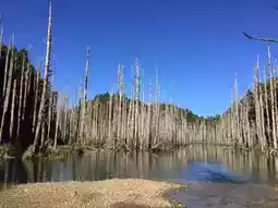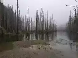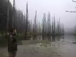 The hazy mist drifts among the trees, with withered wood standing silently by the lakeside, reflected on the tranquil water surface, resembling a breathing, fantastical painting.