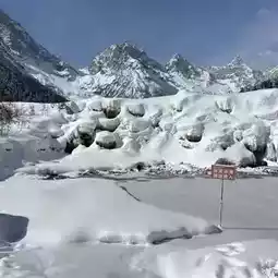 🏔️ Tourists like to visit this season. The weather is very cold, with temperatures ranging from -5 to 3 degrees Celsius. Snow has accumulated up to 60 centimeters. The valley has become a snowy land, with trees covered in white. The scenery is so beautiful that it seems unreal. During this season, tourists can enjoy winter sports and hot springs. Some of the trails may be covered in snow or ice, but you should wear shoes suitable for walking through the snow. There is also ice jet skiing available. The photo corners are surrounded by beautiful snow-capped mountains, making it a real highlight. Anyone who visits will definitely love it.