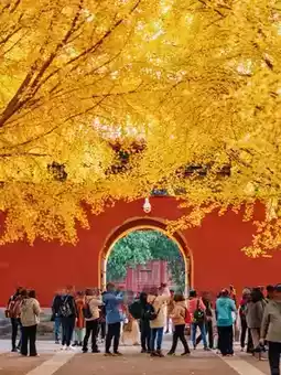 Forbidden City (Palace Museum) – Golden ginkgo under yellow tiles and red walls (late Oct – early Nov)