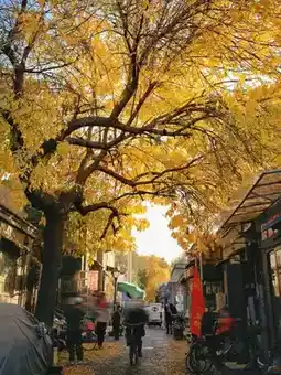 Sanlidong Dongba – Golden ginkgo avenue among embassy district (mid–late October)