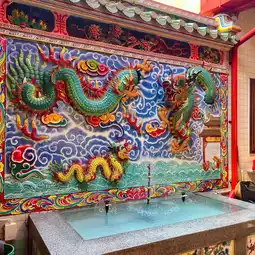 Inside the shrine, there is an altar to worship Leng Buai Eia or the Dragon Tail God. On the left side is an altar to worship the God Guan Yu and on the right side is an altar to worship the Goddess of Heaven. There are pillars in the shape of a dragon coiling around them. On the right side near the door is an ancient bell that was built during the reign of Emperor Daoguang of the Qing Dynasty. The shrine itself is a Chinese architectural style. It is a single building with a large roof covered with colored glazed tiles. There are two dragons facing each other on top.