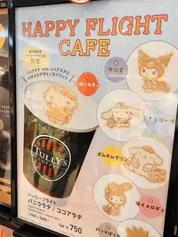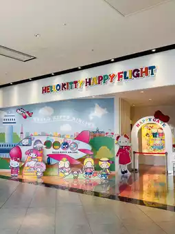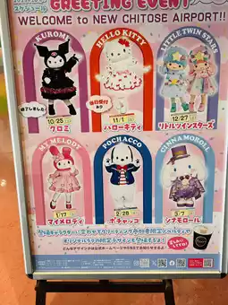 Inside New Chitose Airport, a pink sign poked through the sky-blue signs: HELLO KITTY HAPPY FLIGHT.