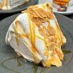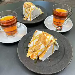 This fluffy, pure white chiffon cake is incredibly light and airy! You can choose between caramel or chocolate sauce to pair with it. The fine, melt-in-your-mouth texture was absolutely delightful.
