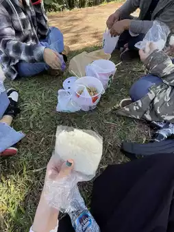 There is a small picnic or camping area, but you have to find it because it is not very big. You can bring a mat and eat, but there will be trash cans at various points.