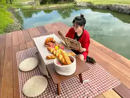 A natural cafe from the entrance, surrounded by trees, good atmosphere, beautifully arranged zones, many photo corners, a corner by the water, you can sit and chill. The shop is decorated with minimalist wooden furniture. There are both indoor and outdoor seating areas.
