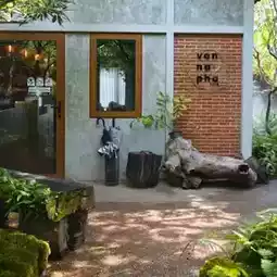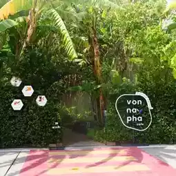 😍 VONNAPHA CAFE is a cafe hidden in a beautiful garden with a shady atmosphere. There is an artificial waterfall and various trees, making you feel like you have entered the forest. A must-try menu is "Sunrise Vonnapha", a coffee mixed with orange juice that is perfectly refreshing. There is also "Von Forest", a bright green drink that combines the flavors of green tea and fruits. For those who love sweets, "Pumpkin Cheesecake" is another recommended menu with a sweet pumpkin flavor and a soft and smooth cake texture.