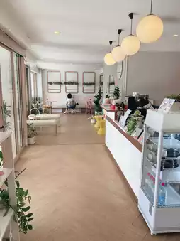 The shop is decorated in white and light pink tones, creating a warm and lovely atmosphere. There are many photo spots both inside and outside the shop.
