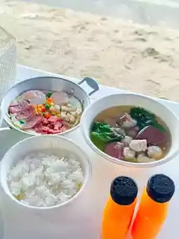 The warmth served on the plate includes fried eggs, bacon, pork roll, tofu, sausage, and not enough, there is also hot steamed rice paired with a delicious pork blood soup, packed with minced pork, organs, and vegetables