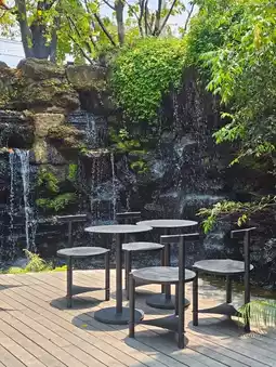The seating options include both indoor and outdoor areas, with a serene waterfall garden complete with fish, creating a relaxing atmosphere. Every corner of the café is perfect for capturing beautiful photos. As for the menu, there’s a wide variety of beverages and baked goods to choose from, all of which are not only visually appealing but also delicious.