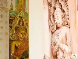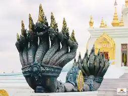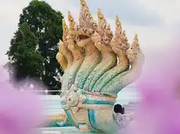 Located in Wat Saensuk, Chonburi Province, this beautiful pagoda stands out with its four-colored Naga staircase surrounding the four directions. Each direction has a different color of Naga, such as green, gold, yellow, blue, and navy blue, creating a beautiful and unique look. Inside, there are relics from Sri Lanka and a golden Buddha statue in the middle of the dome. The atmosphere is peaceful.