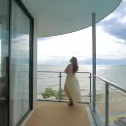 🌊 The accommodation is designed with a curved sea view from every angle. Every room faces the sea, so no matter which angle you look at it from, you'll get a full view of the clear sky and the sea. The highlight that must be mentioned is the infinity pool in the middle of the hotel, surrounded by floating daybeds. It's perfect for sitting and sipping drinks, taking pictures, or even swimming, which is super refreshing.