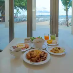 ☕ The hotel also has a cafe. For breakfast, I must say that the breakfast is very filling. There's seafood, shrimp, and squid. Most importantly, the food is very delicious. For dinner, if you don't want to go far, next to the accommodation is the Seafood Club Bangsaen restaurant, a famous restaurant in Bangsaen, which is also a chain restaurant of hotels.