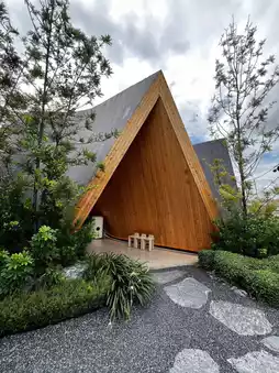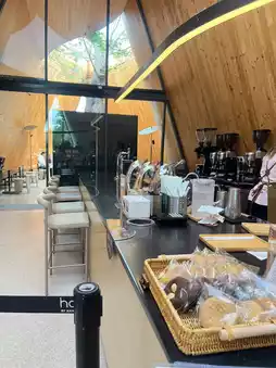 📍A landmark in Chonburi featuring Modern Japanese architectural design, characterized by its unique triangular house shape. The interior is surrounded by clear glass, offering panoramic views and various photo spots. The venue includes both indoor and outdoor zones, with a wave-shaped curved building and an ancient olive tree. Enjoy delicious beverages and a wide selection of bakery items.