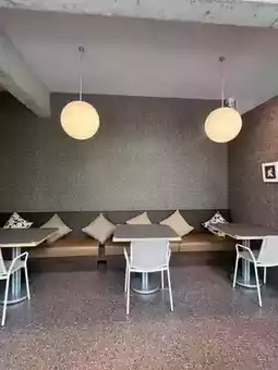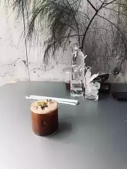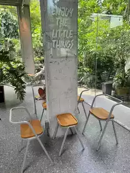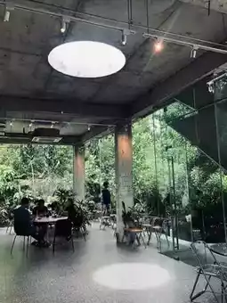 A minimalist loft-style cafe in the middle of a garden, hidden in a shady natural atmosphere. The shop is a bare concrete building combined with large glass windows, allowing natural light and a perfect view of the green garden. Very chill, for those who like to come and work, I recommend it. 🌿