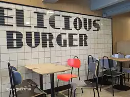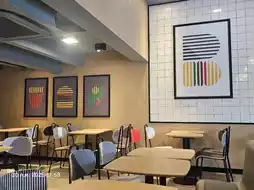 🖼️ The walls are decorated with minimalist burger graphics, adding a chic touch.