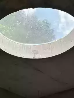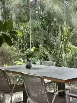 This cafe is made from raw concrete and decorated with glass on all sides. The outdoor area is surrounded by trees, creating a sense of closeness to nature. #ChonburiTravel #ChonburiCafe #BangsaenCafe