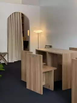 This small cafe has simple decor, with clean white and wood tones. They offer a wide selection of drinks and desserts. I really love their desserts. I ordered a chocolate tart. The desserts are served in a minimalist, minimalist style, and look amazing. They also taste delicious. For drinks, I ordered the peach tea, which was also quite refreshing. I think they recently started offering freshly fried churros. The choco crunch churros looked so delicious! I'll definitely try them next time I'm in Bangsaen!