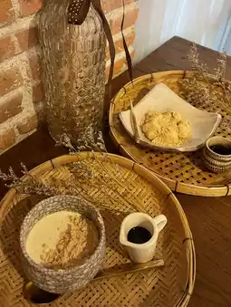 For dessert, we ordered the warabi mochi (100 baht). It had a soft and chewy texture and a strong kinako bean aroma. Topped with sauce, it was incredibly delicious. We also ordered the soy milk pudding (105 baht), a soy milk pudding served with a sauce. It was delicious and smooth, with a mild soy flavor. Overall, it's quite pricey, but delicious. Come and try it! 😆