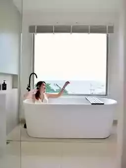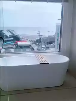 The white, clean, and comfortable accommodations are new and not too large. The bathroom even has a bathtub with a view.
