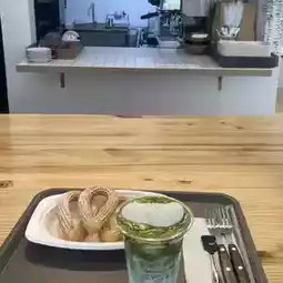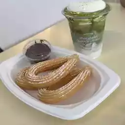 The menu offers a wide selection of drinks and desserts, but the churros are a must-try. Pair them with various drip sauces, including the chocolate sauce. For a drink, I recommend the green tea cream cheese. The drink is rich, delicious, and creamy, pairing perfectly with the churros.