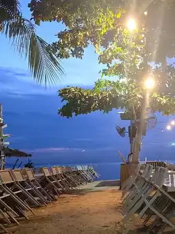 The restaurant is located by the beach, spacious, and features a fire show at night 🌴🎇