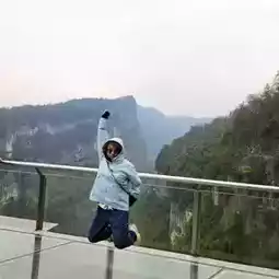 First stop is the 天生三桥玻璃观景眺台, a panoramic view of the mountains and a test of your fear of heights. At the encouragement of the tour guide, more people step forward onto the glass bridge to take in the extraordinary view. I was challenged to take a jump shot, and I did it!