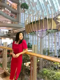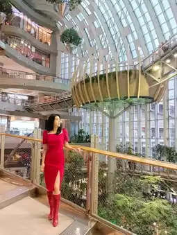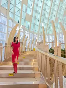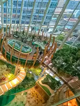 The ring chongguang 光环购物公园 shopping mall has 7 floors. Inside the building, in addition to leading shops, coffee shops, restaurants, there is also an indoor botanical garden area. There is a 42-meter high dome decorated as a garden and waterfall. In front of the mall, there is another photo spot, a white dome with a very cool design.