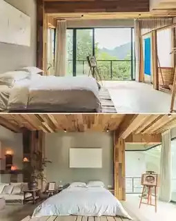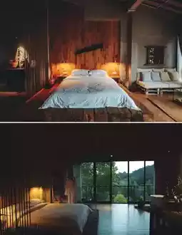 Rooms are cleverly named after everyday pleasures and scholarly pursuits like "Listening to Music by the Firewood," "Playing Chess with Rice," and "Toasting with Vinegar," ingeniously blending daily life with literary elegance. Panoramic floor-to-ceiling windows in each room face directly toward the forest—open them in the morning to see rolling clouds, and at night sleep under starry skies. Smart door locks, bathtubs, custom tea sets, and high-thread-count cotton bedding show the exquisite attention to detail and warmth of mountain living.
