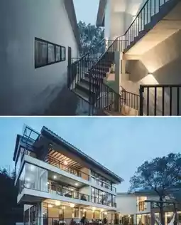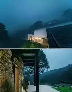With "seclusion" as its soul, designers transformed an old house with remaining rammed earth walls into a modern aesthetic space with steel frame and glass structure. The old walls carry the vicissitudes of time, while transparent glass curtain walls bring mountain forests and sea of clouds indoors—where history and nature dance together as light and shadows shift. The terrace features a glass-covered water feature reflecting the sky and trees, where you can watch clouds gather and disperse, capturing forest-themed photos effortlessly.