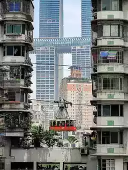 Baixiangju: The corridor of Building No. 3 frames the Yangtze River Cableway + Raffles, retro filter + wide-angle lens 1.