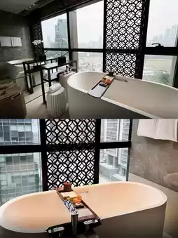 Rooms start from 57 sqm, offering ample space. The modern Chinese decor incorporates many Chongqing elements, like unique patterns on the carpets and artistic mountain city paintings on the walls. Amenities include a Dyson hairdryer, Bluetooth speaker, and wireless charging. The mini-bar is complimentary, and three pieces of laundry or ironing are free daily—perfect for someone like me who’s a bit lazy~
