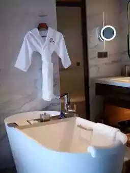 Our cloud-themed family suite on the 51st floor sparked immediate cheers from my little one upon entry. Panda motifs dominated the space—from bedding to throw pillows—while the living area featured an adorable panda tent 🏕. Thoughtful touches included panda-printed kids' amenities: toothbrush cups, slippers, robes, and a bathtub that had him begging for splash time 🛁.