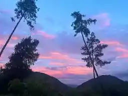 Strolling along the mountain paths around the villa, the late autumn breeze carries the fresh scent of grass and trees past your ears. Looking up, the layered mountains are dyed in varying shades of ink by the sunset glow, while the sky becomes the creator's canvas—first, the orange-red clouds leap like flames on the horizon, outlining the cliffs more deeply; then, the pink-purple clouds spread like light silk across the sky, complementing the white tents on the lawn, as if you have stepped into a fairy tale camping secret.