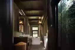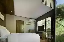 The stone walls here hold stories of the forest, and opening the door reveals the surprise of embracing nature. The guest rooms blend wooden textures with modern amenities, while large floor-to-ceiling windows frame the mountain scenery like a dynamic painting. Lying in bed feels like sleeping in the arms of the forest. The bathroom design is equally thoughtful, where amidst the misty steam, you can catch glimpses of bamboo shadows swaying outside the window—private yet poetic.