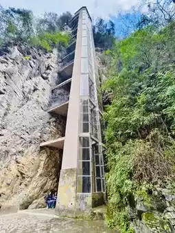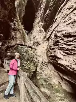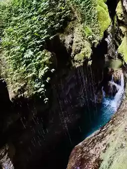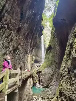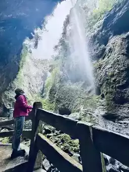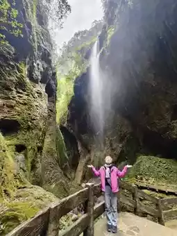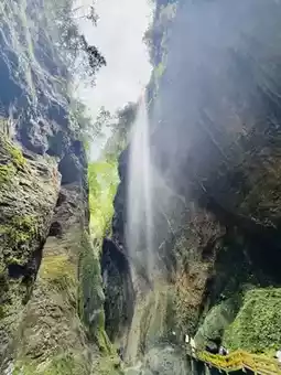 A winding two-kilometer trail descends, with sheer cliffs on either side as sharp as a knife. Just a sliver of sky overhead, a gurgling stream at your feet. A waterfall cascades down the rock face, a breathtaking spectacle. 👍