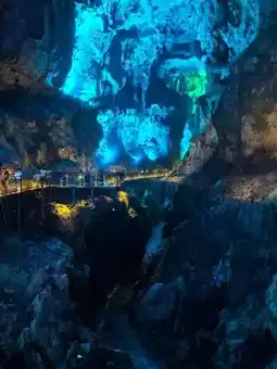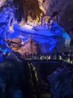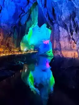 🌎 As soon as you enter the cave, it feels like you've instantly traveled to another dimension! The bizarre stalactites, illuminated by colorful lights, shimmer and sparkle like a dream~ Some look like cascading waterfalls, others like the mythical Sea-Calming Needle, and some resemble underwater coral forests… Nature’s billions of years of craftsmanship are vividly displayed here!✨