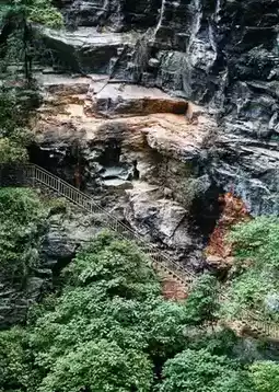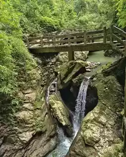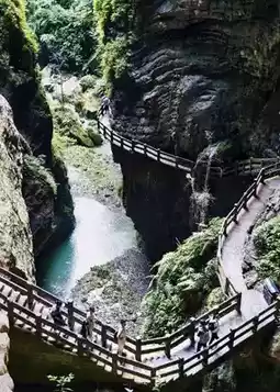 The most stunning aspect of Longshui Gorge Fissure is the feeling of "being at the bottom of the valley, looking up at a small sky." Walking on the plank road, water flows beside your feet, changing direction due to terrain and scattered rocks, sometimes rushing, sometimes slow. Being at the valley bottom, looking up at the small sky, with winding paths, distant trees, and white clouds, you can’t help but feel a sense of hope and renewal.