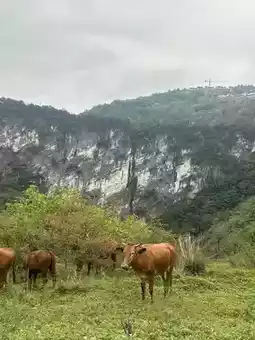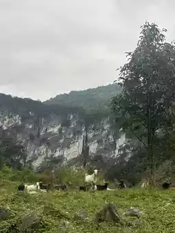 The cliff walls show textures of gray-white and deep green, yellow cattle and goats scattered on the slope, clouds hanging low, and the wind carries the scent of grass and trees into your collar. No need to rush, just stroll along the grassy path, chat briefly with local herders you meet, the rustic mountain life feels more touching than tourist spots~