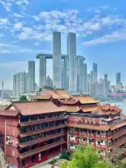 Hongyadong, or Hongya Cave, is a striking complex of 11-story stilted buildings in Chongqing, China, perched on a cliffside along the Jialing River. It is one of the city's most popular attractions, famous for its unique architecture, vibrant nightlife, and resemblance to the bathhouse from the animated film Spirited Away. The complex is built in the traditional Bayu architectural style, a type of stilted house common in the mountainous terrain of southwestern China.