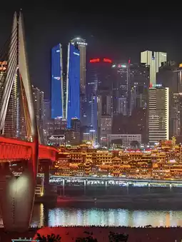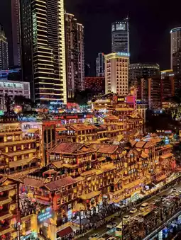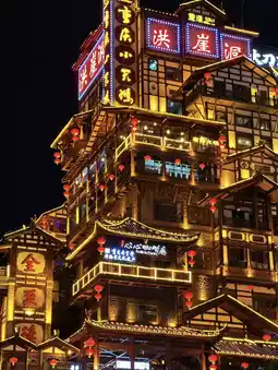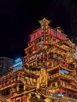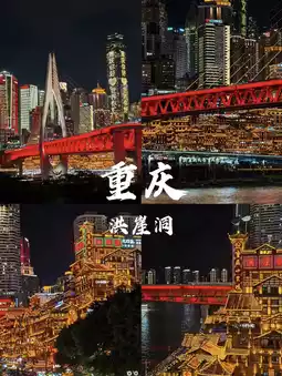 英文TIPS推荐洪崖洞:想要感受重庆的真实氛围,一定要去洪崖洞看看,令人惊叹的夜景结合了悬崖峭壁上的中国古代木质建筑和河面映照的耀眼摩天大楼,但是,要做好人群的准备!晚上,整个区域都挤满了人,尝试一些当地小吃,如辣面、烧烤串、臭豆腐,完全值得在热闹的同时漫步其中的热闹场景。
