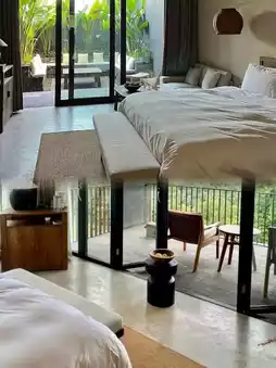 🛏️Room layout: The hotel has more than 20 rooms, each with a spacious area of at least 60 square meters. The rooms use wood, cushions, and micro-cement to interpret the modern Chinese style. The combination of log, terrazzo, and natural light creates a simple and quiet wabi-sabi charm. The rooms are also equipped with high-end facilities such as Dyson hair dryers, Marshall speakers, and Hansgrohe shower systems, showing luxury in every detail.