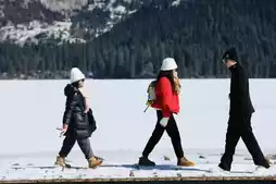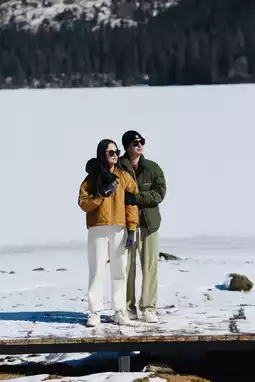 A young lady enjoys the entire snowy mountain alone in the snowfield